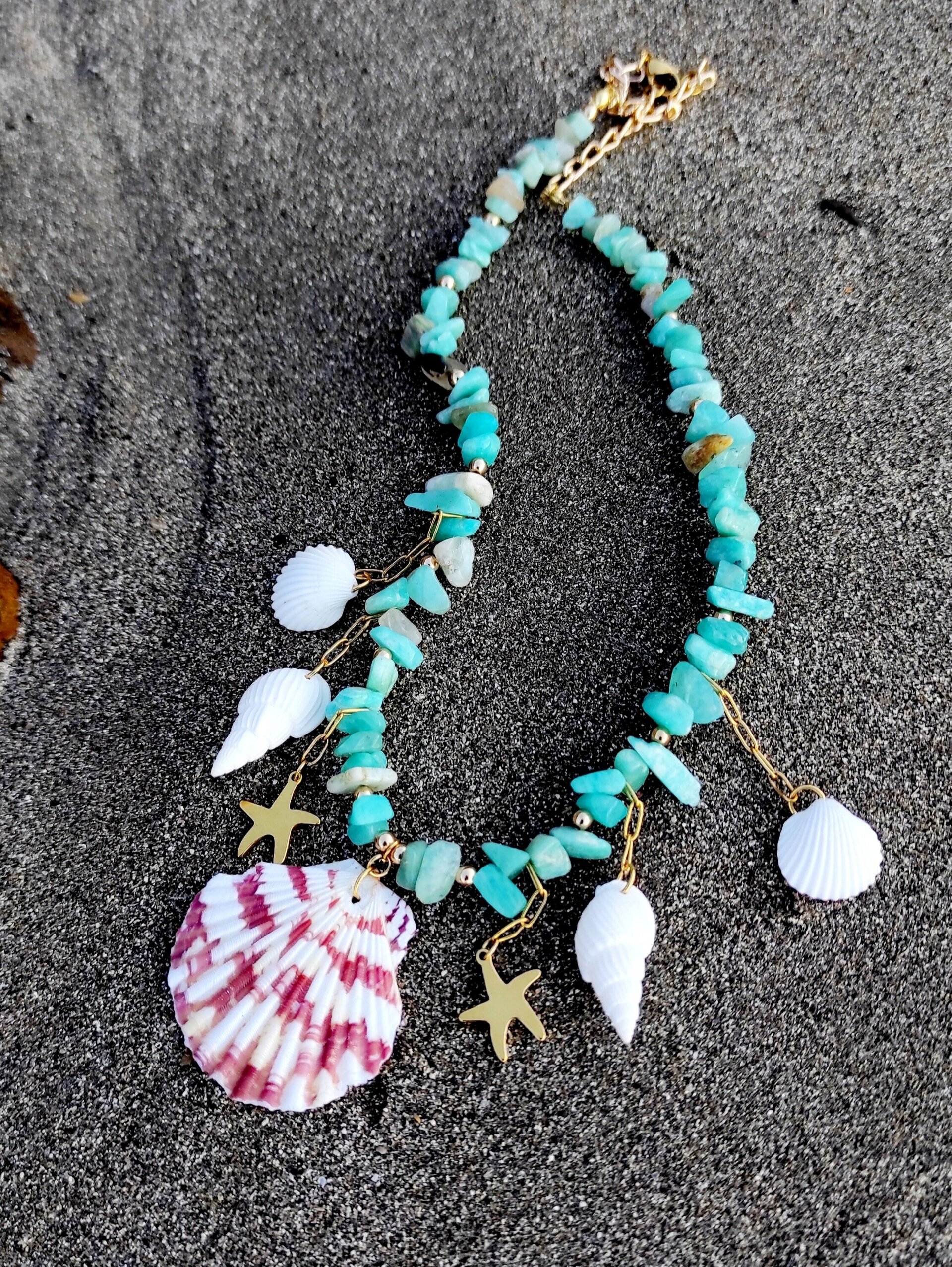 Collar concha Vieira,perla natural y piedras semipreciosas