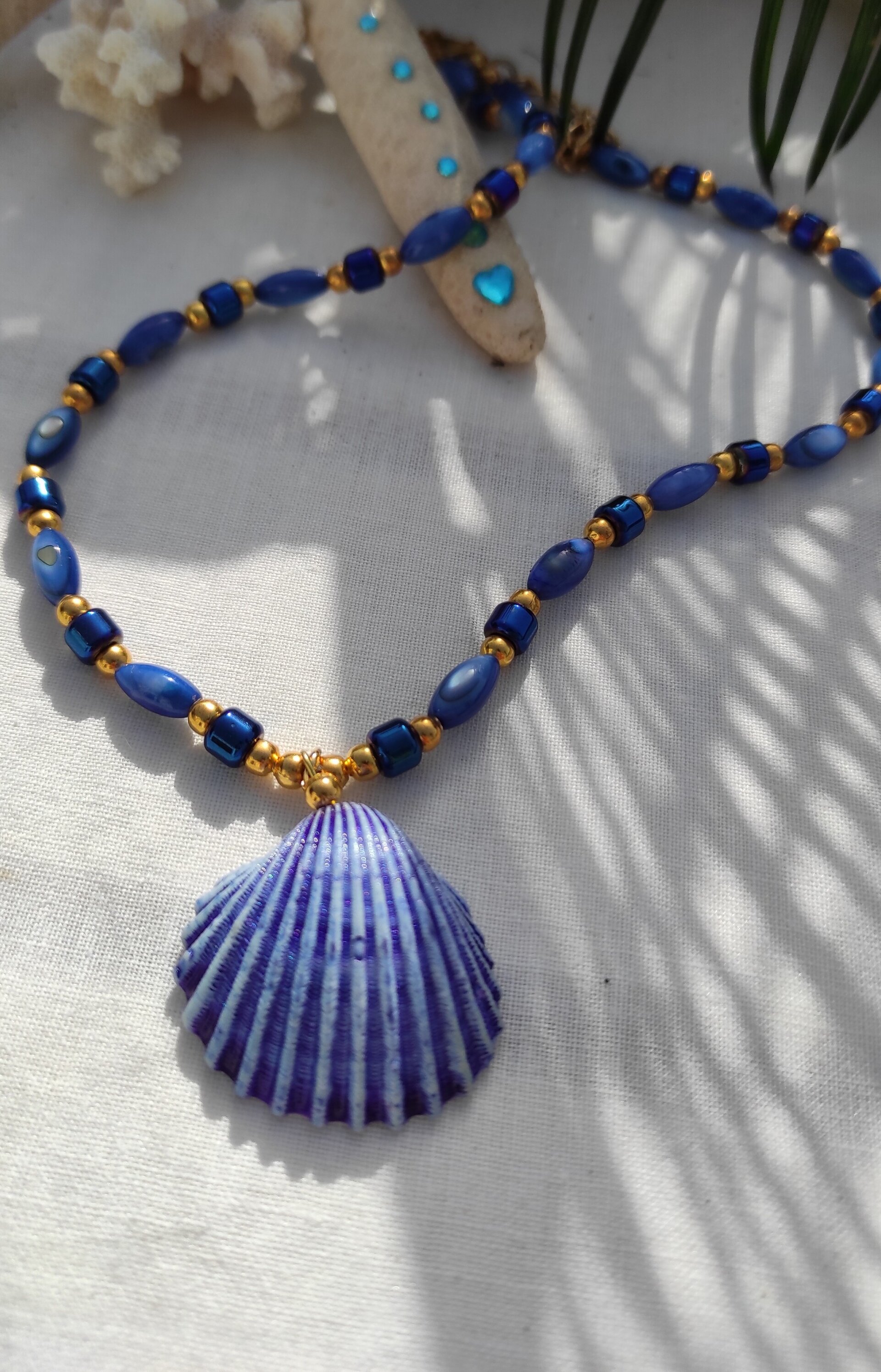 Collar con concha marina teñida de azul marino y perlas de nácar teñidas de azul combinadas con piedras hematítes azules y bolas de hematítes bañadas en oro. Lleva cadena para alargar de acero bañada en oro con cierre mosquetón.