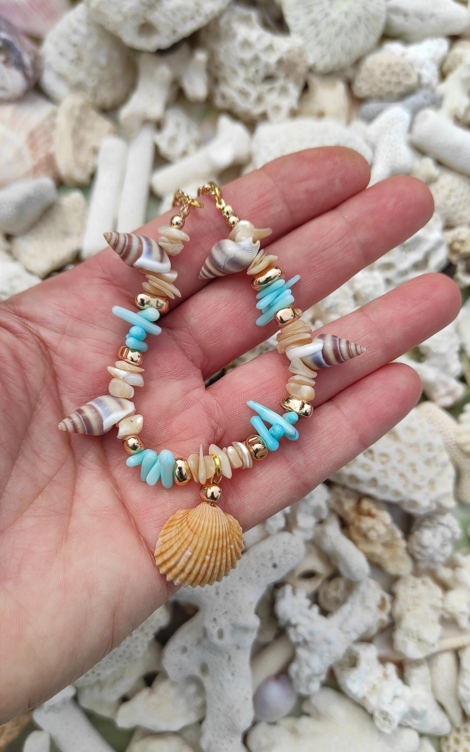 Collar gargantilla cadena con pequeña concha y caracolas con cuentas de nácar, coral turquesa y hematítes bañados en oro. Cadena de acero bañada en oro y cierre mosquetón.