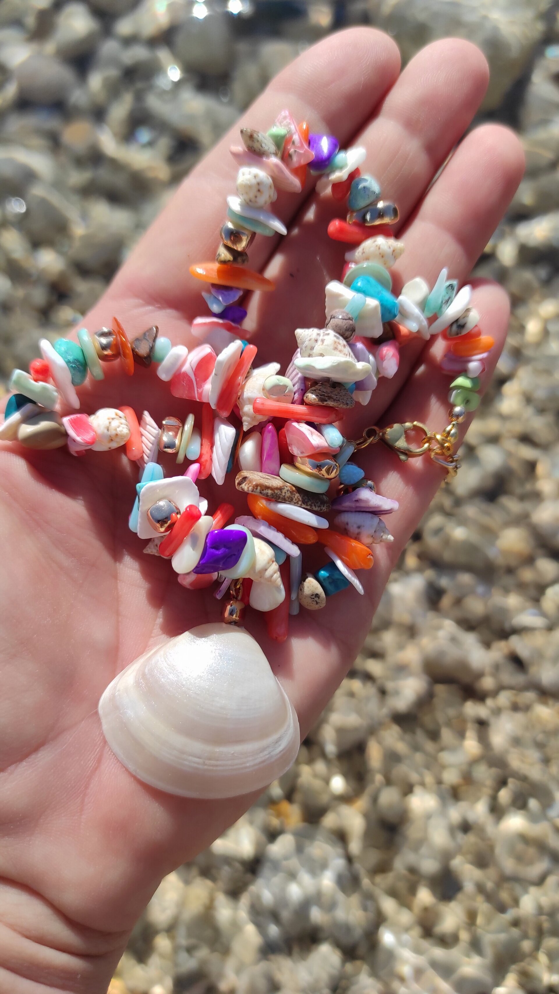 Maravilloso collar de cuentas de diferentes trozos de conchas multicolor ,caracolas, coral y colgante concha natural nacarada. Lleva cadena de acero bañada en oro y cierre mosquetón.