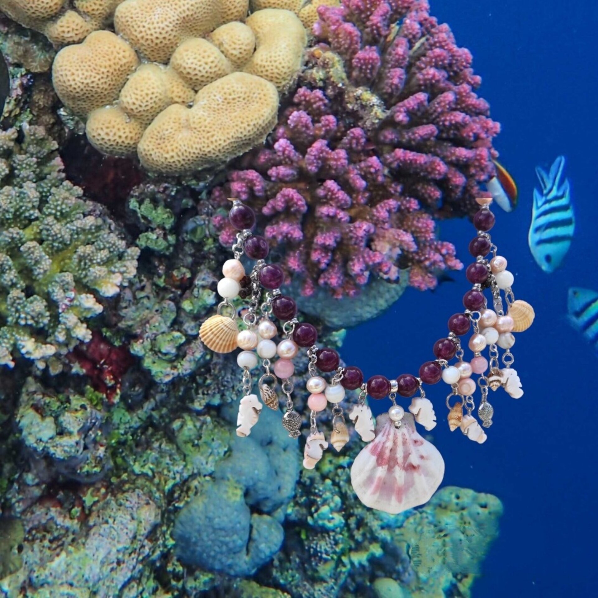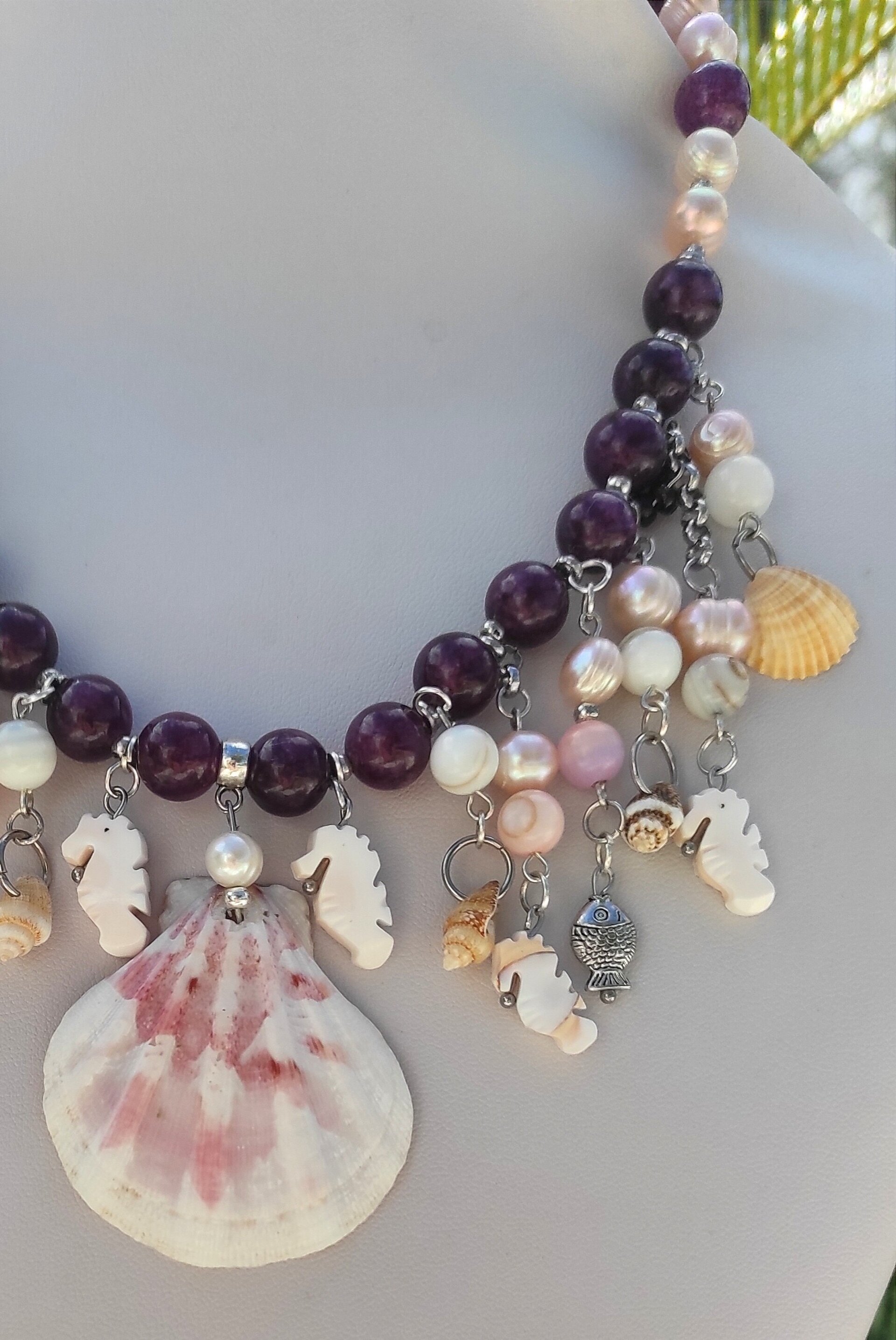Fabuloso y espectacular collar único y exclusivo, compuesto por concha vieira natural y piedras semipreciosas lepidolita, perla rosa, nacar, concha caballito de mar y pequeñas caracolas. Lleva cierre mosquetón y cadena para alargar plateados.