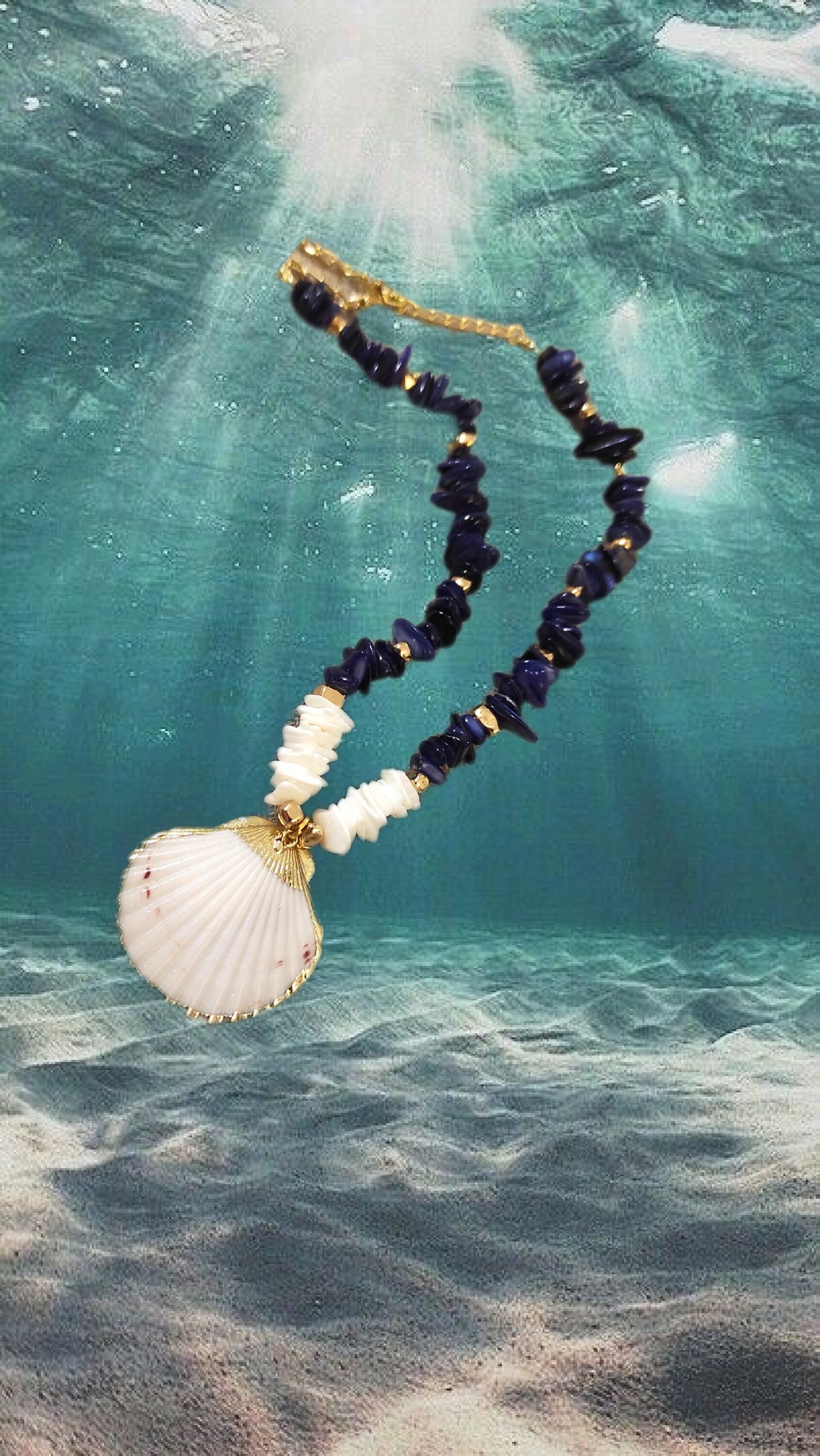Elegante collar de nácar azul mar-profundo con chips de concha blanca y colgante de vieira natural blanca. Lleva intercaladas piedras hematítes bañadas en oro y cadena de acero, cierre mosquetón bañados en oro.
