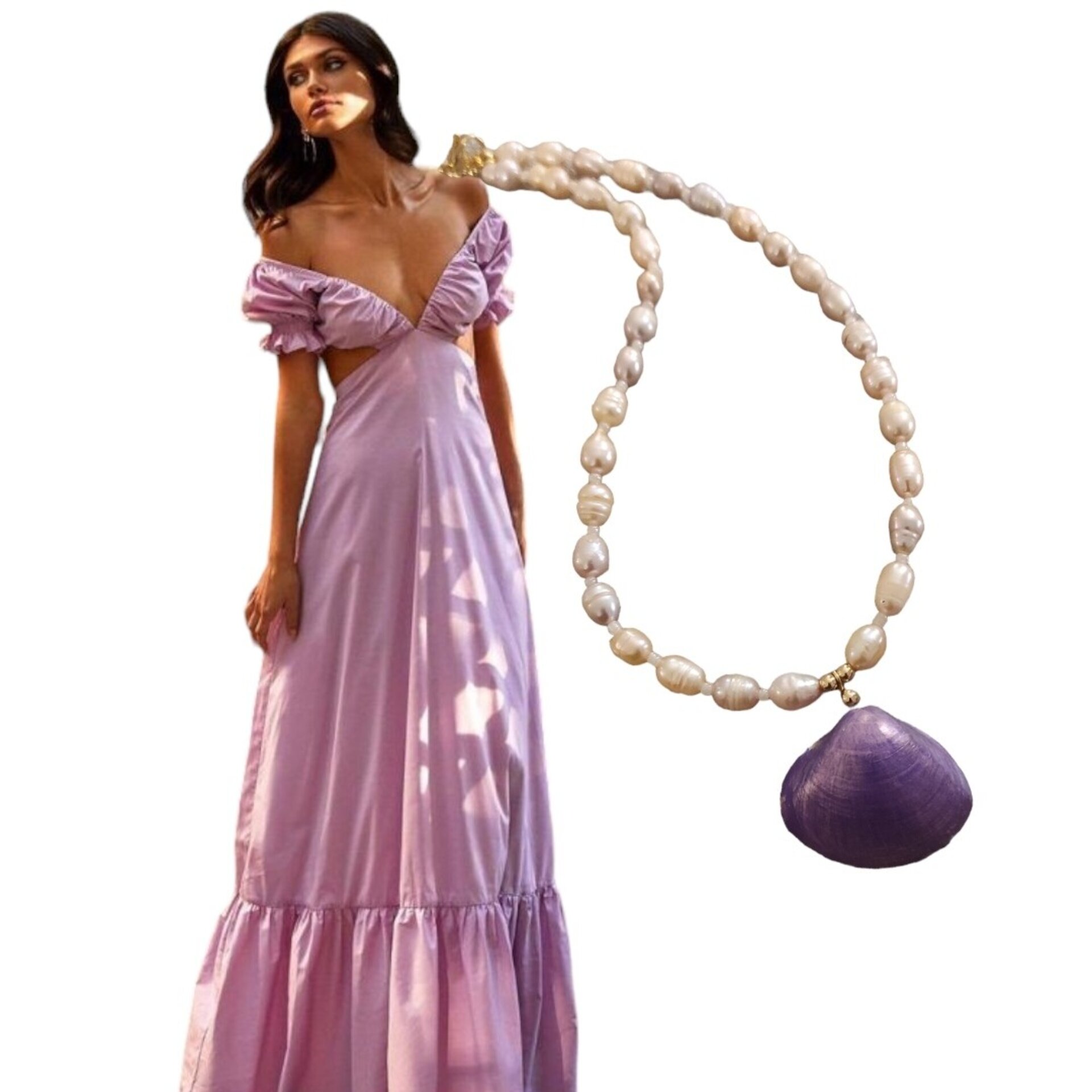 Bonito collar compuesto por auténtica perla en tono rosado y colgante concha marina natural teñida en morado. Lleva cierre mosquetón en acero bañado en oro.