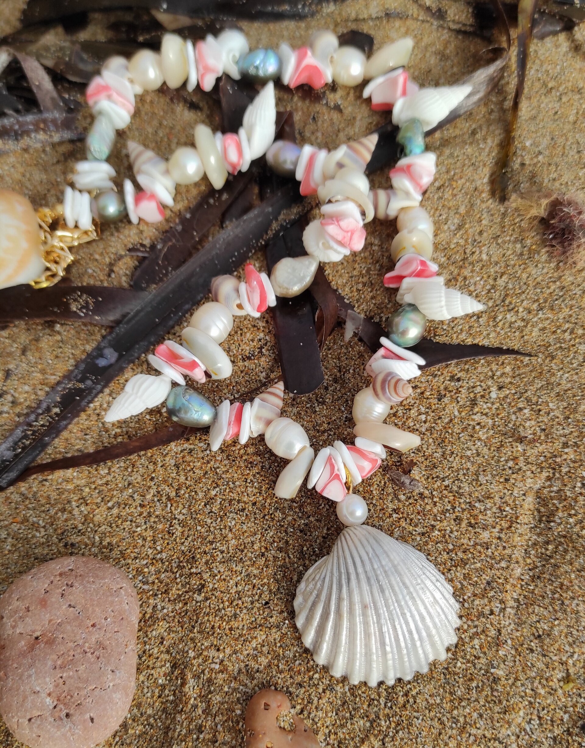 Bonito collar marino de perlas blancas y grises combinadas con pequeñas caracolas marinas, caracol kauri y chips de concha rosa y blanca. Lleva colgante de concha natural teñida en